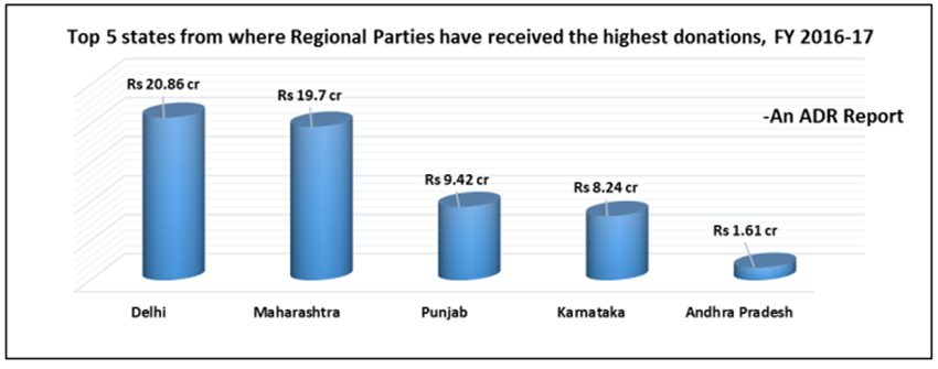 चंदा देने वालों में दिल्ली सबसे आगे है। साल 2016-17 में दिल्ली वालों ने सभी क्षेत्रीय दलों को कुल 20.86 करोड़ रुपये चंदा दिए जबकि महाराष्ट्र ने 19.7 करोड़, पंजाब ने 9.42 करोड़, कर्नाटक ने 8.24 करोड़ और आंध्र प्रदेश ने कुल 1.61 करोड़ रुपये क्षेत्रीय दलों को बतौर चंदा दान किया है। बता दें कि सुप्रीम कोर्ट के निर्देश के बाद चुनाव आयोग ने सभी दलों से 20,000 रुपये से ऊपर के सभी चंदों का विवरण देना अनिवार्य कर दिया है। इसके साथ ही सभी राजनीतिक दलों को आय-व्यय का सालाना विवरण भी आयोग को देना होता है।