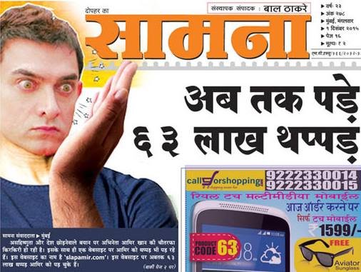 शिवसेना के मुखपत्र में लिया गया है, ‘असहिष्णुता और देश छोड़ने वाले बयान पर अभिनेा आमिर खान की चौतरफा किरकिरी हो रही है। इसके साथ ही एक वेबसाइट पर आमिर को थप्पड़ भी पड़ रहे हैं। इस वेबसाइट का नाम है ‘slapaamir.com’। इस वेबसाइट पर अब तक 63 लाख थप्पड़ पड़ चुके हैं।’ अखबार ने लिखा है कि इस वेबसाइट को मायामी ऐड स्कूल के छात्रों ने बनाया है।