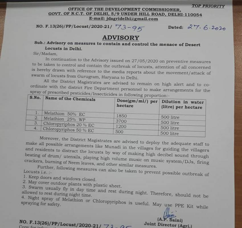अधिकारियों ने बताया कि मंत्री ने प्रशासन को सतर्क रहने के निर्देश दिए हैं। गोपाल राय ने  कहा कि ‘‘आपात बैठक के बाद स्थिति से निपटने के लिए उठाए जाने वाले कदमों पर एक परामर्श जारी किया जाएगा।’’ उन्होंने कृषि विभाग के अधिकारियों को गुरुग्राम के पास के इलाकों का दौरा करने के निर्देश दिए। अधिकारियों ने बताया कि विकास सचिव, मंडल आयुक्त, निदेशक, कृषि विभाग और दक्षिण तथा पश्चिम दिल्ली के जिला मजिस्ट्रेट बैठक में शामिल हुए।