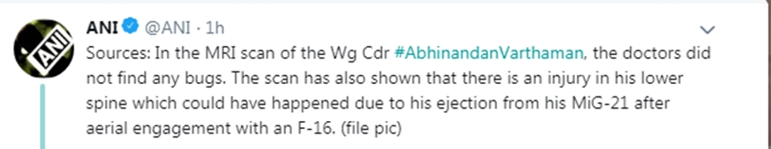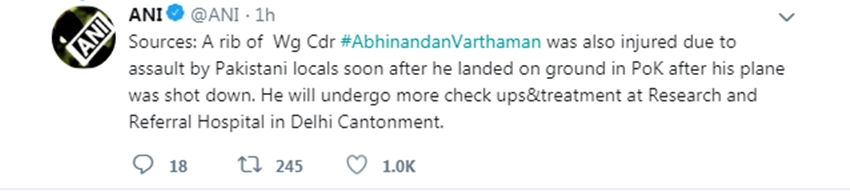 एएनआई ने आगे लिखा, “विंग कमांडर की अभिनंदन की एक पसली में भी चोट है। ऐसा मिग क्रैश के बाद जमीन पर पाकिस्तानियों द्वारा दुर्व्यवहार की वजह से हुआ है। दिल्ली छावनी स्थित रिसर्च एंड रेफरल हॉस्पीटल में उनके शरीर के अन्य हिस्सों की जांच की जाएगी और उपचार किया जाएगा।”