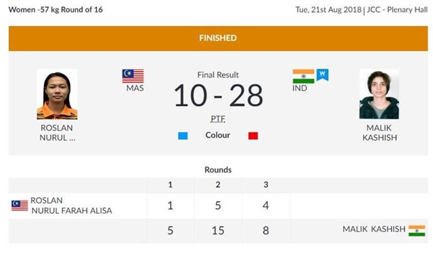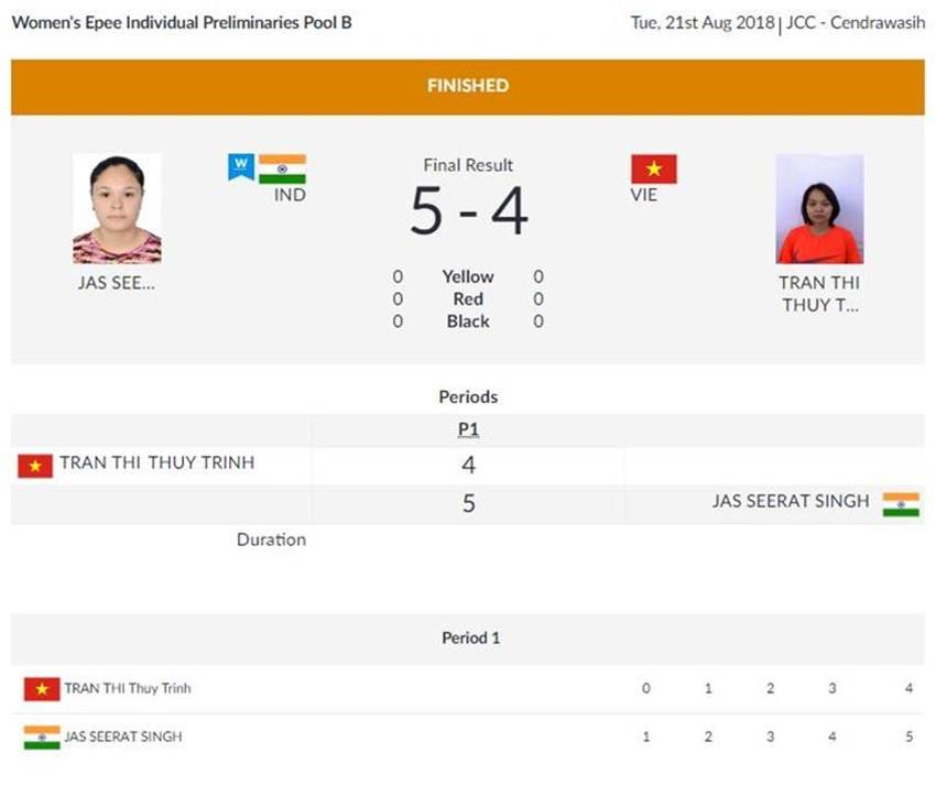 भारतीय फेंसिंग खिलाड़ी जसजीरत सिंह ने वियतनाम की खिलाड़ी त्रान थी को 5-4 से मात दे दी। वहीं भारतीय ताइक्वांडो खिलाड़ी कशिश मलिक ने महिलाओं के 57 किलो भारवर्ग में जीत हासिल कर क्वार्टर फाइनल में जगह बना ली है।
