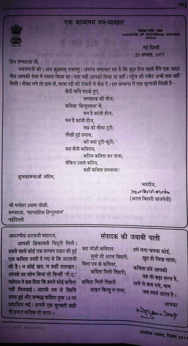 कविताएं और गीत साहित्य प्रेमी वाजपेयी के भावनाओं का उदगार थीं। कविताओं में उनका दर्शन झलकता था। जिंदगी के फलसफे को वो आसान शब्दों में पन्नों पर उतार देते थे और लोगों तक अपनी बात कह जाते थे। 1977 में वाजपेयी जब देश के विदेश मंत्री थे तो उन्होंने अपनी एक कविता ‘साप्ताहिक हिन्दुस्तान’ में छपने के लिए भेजी थी। उस वक्त मूर्धन्य साहित्यकार और पत्रकार मनोहर श्याम जोशी ‘साप्ताहिक हिन्दुस्तान’ के संपादक थे। जब वाजपेयी जी की कविता नहीं छपी तो उन्होंने संपादक मनोहर श्याम जोशी को एक चिट्ठी लिखी। यूं तो ये चिट्ठी उलाहना देने के लिए लिखी गई है, लेकिन इसकी भाषा इतनी रोचक और प्रभावी है कि संपादक महोदय बिना प्रभावित हुए नहीं रह सके।