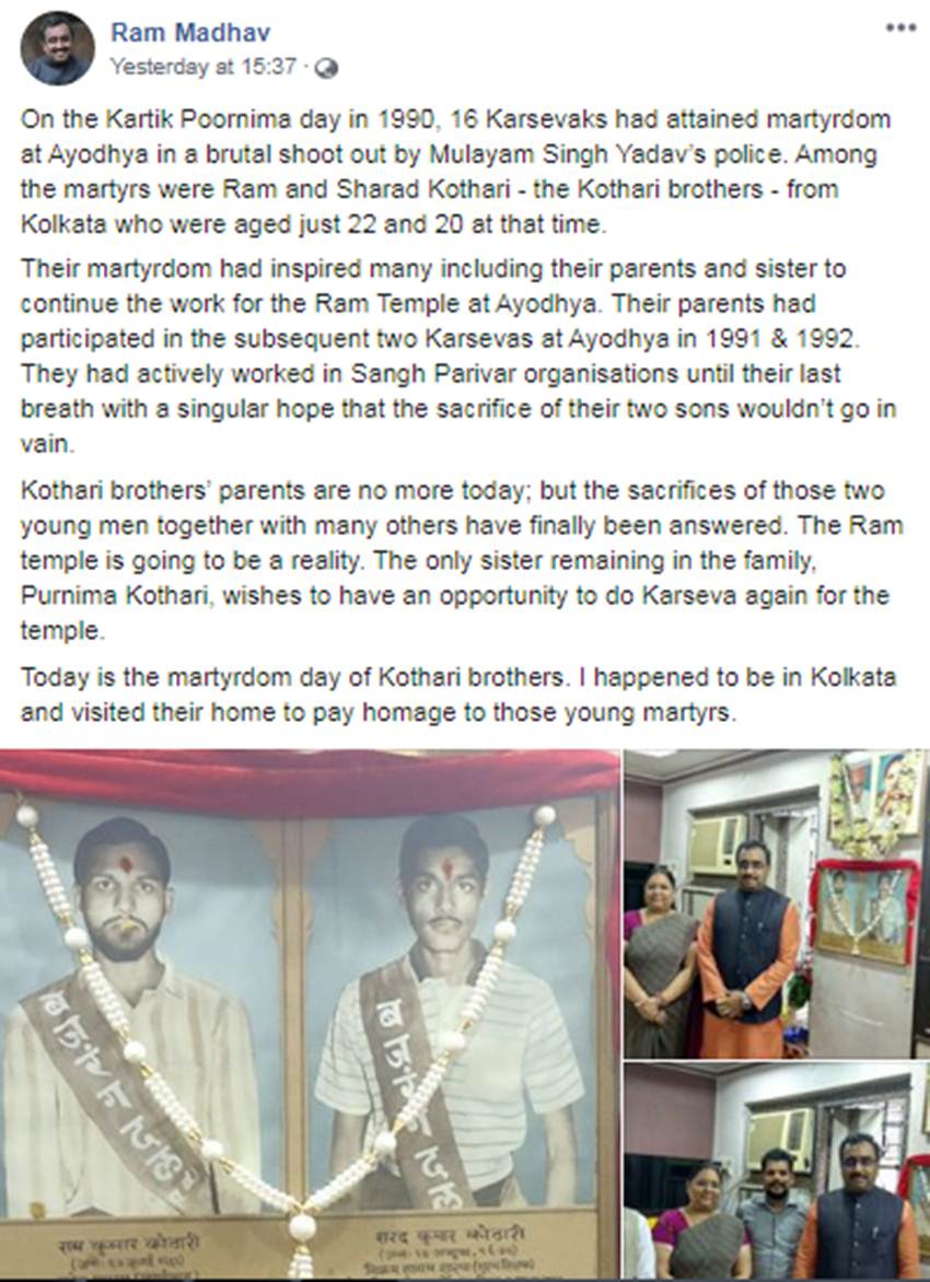माधव इस दौरे के बारे में Facebook पोस्ट किया। उन्होंने लिखा, “1990 में कार्तिक पूर्णिमा पर 16 कारसेवक अयोध्या में मुलायम सिंह यादव (तत्कालीन CM) द्वारा बर्बर पुलिस फायरिंग में शहीद हो गए थे। राम और शरद कोठारी भी इनमें थे। ये कोठारी बंधु कोलकाता से थे, जो कि तब 20 से 22 साल के बीच के थे।”