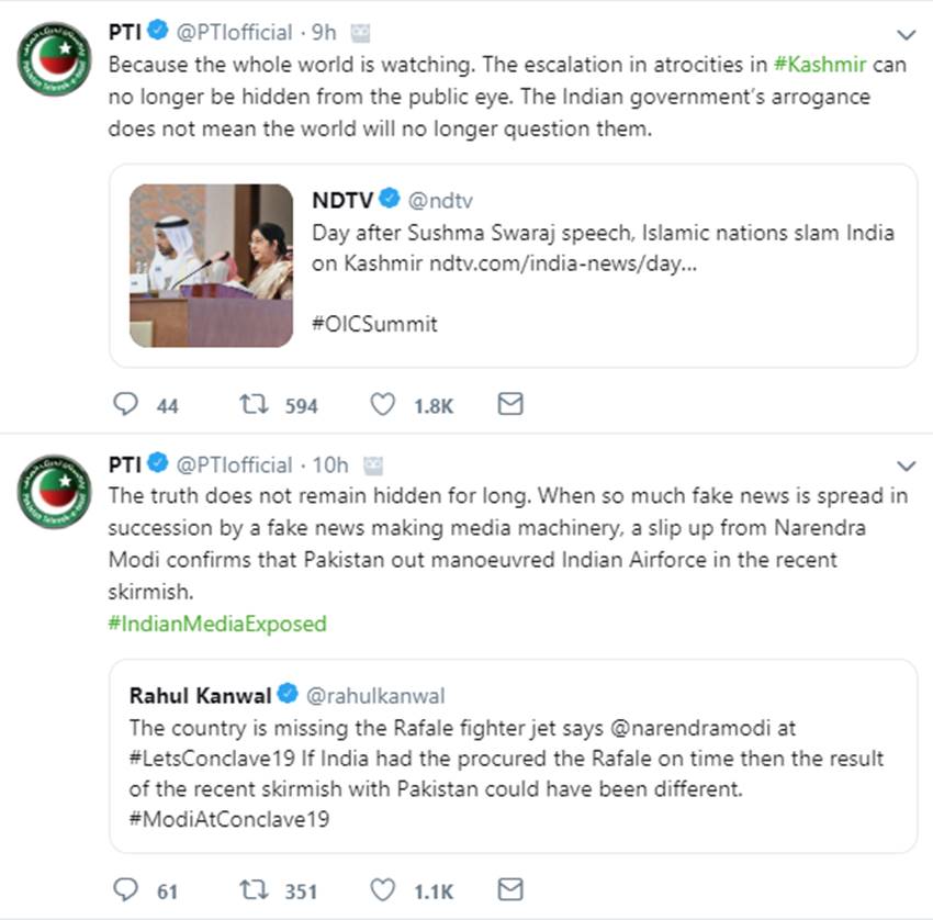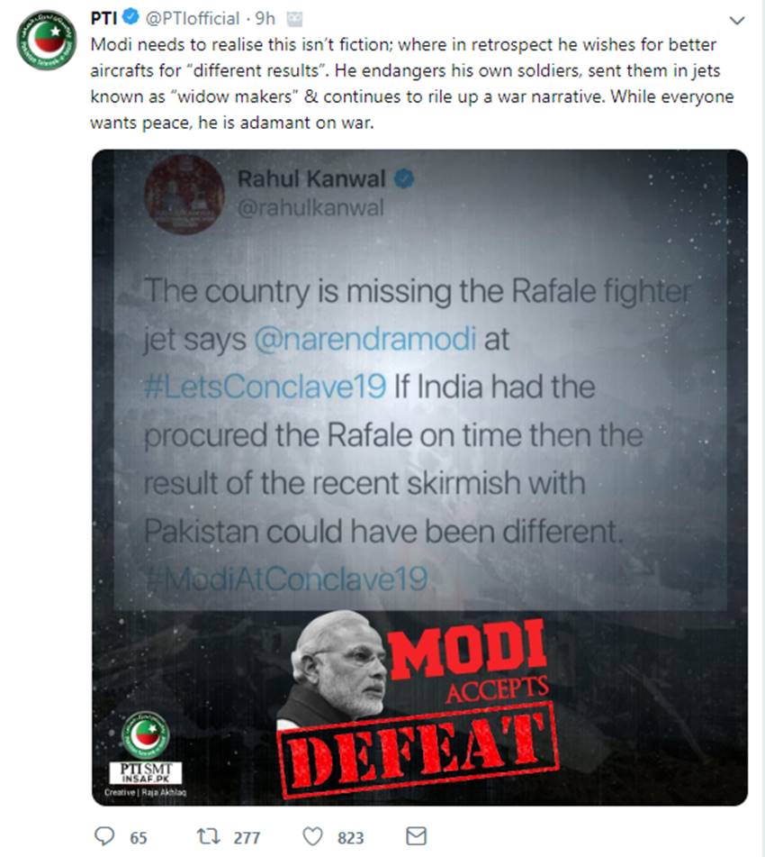 एक अन्य ट्वीट में PTI ने कहा, “मोदी को यह समझने की जरूरत है कि यह सब कोई कल्पना नहीं है। बीत बातों को याद करते हुए वो “अलग नतीजों” के लिए बेहतर एयरक्राफ्ट चाहते हैं। वह अपने सैनिकों को खतरे में डालते हैं, “विडो मेकर्स (विधवा बनाने वाले)” के नाम से कुख्यात जेट्स में भेजते हैं और युद्ध का माहौल बनाते हैं। जहां हर कोई शांति चाहता है, वो युद्ध पर आमादा हैं।”