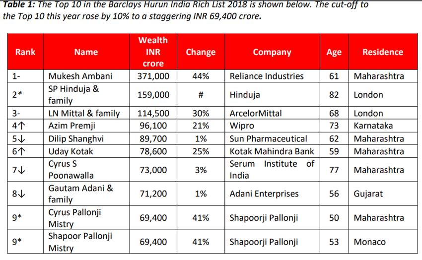 आपको बता दें कि बार्कलेज की इस लिस्ट में भारत के उन सबसे अमीर लोगों को शामिल किया जाता है, जिनकी नेट वर्थ एक हजार करोड़ रुपए या उससे अधिक होती है। साल 2017 की सूची के मुकाबले इस बार एक तिहाई लोग अधिक लोग शामिल किए गए। पिछले साल सूची में 617 लोगों के नाम थे, जबकि 2018 में इसमें 831 लोगों के नाम हो गए।
