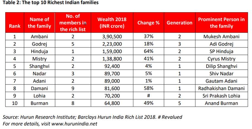 रिपोर्ट में इसके अलावा भारत के 10 सबसे अमीर परिवारों का ब्यौरा भी दिया गया है। उसमें भी अंबानी परिवार ने पहले स्थान पर काबिज रहते हुए बाजी मारी है। सबसे अमीर परिवारों की सूची में अंबानी परिवार के बाद गोदरेज, हिंदुजा, मिस्त्री, सांघवी, नादर, अडानी, लोहिया और बर्मन परिवार के नाम शामिल हैं। बार्कलेज हुरुन इंडिया रिच लिस्ट 2018 में 66 एनआरआई शामिल हैं।