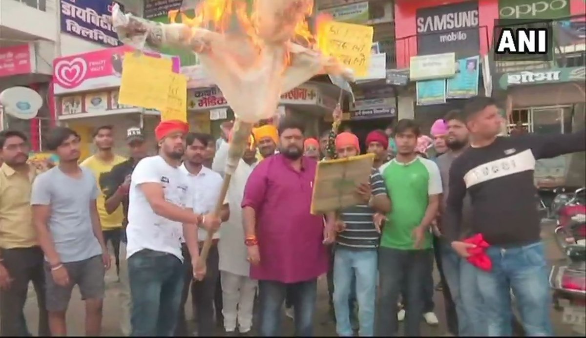 उत्तर प्रदेश के वाराणसी में भी भारत बंद का असर देखने को मिला। एससी-एसटी एक्ट में किए गए संशोधनों के विरोध में तख्तियां लेकर नारेबाजी करते व पुतला फूंकर विरोध जताते प्रदर्शनकारी। (फोटोः ANI)