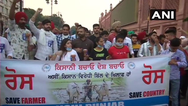 पंजाब: राष्ट्रीय छात्र संगठन (एनएसयूआई) के कार्यकर्ता हाल ही में पारित कृषि बिलों के विरोध में अमृतसर में एक मार्च निकाल रहे हैं।