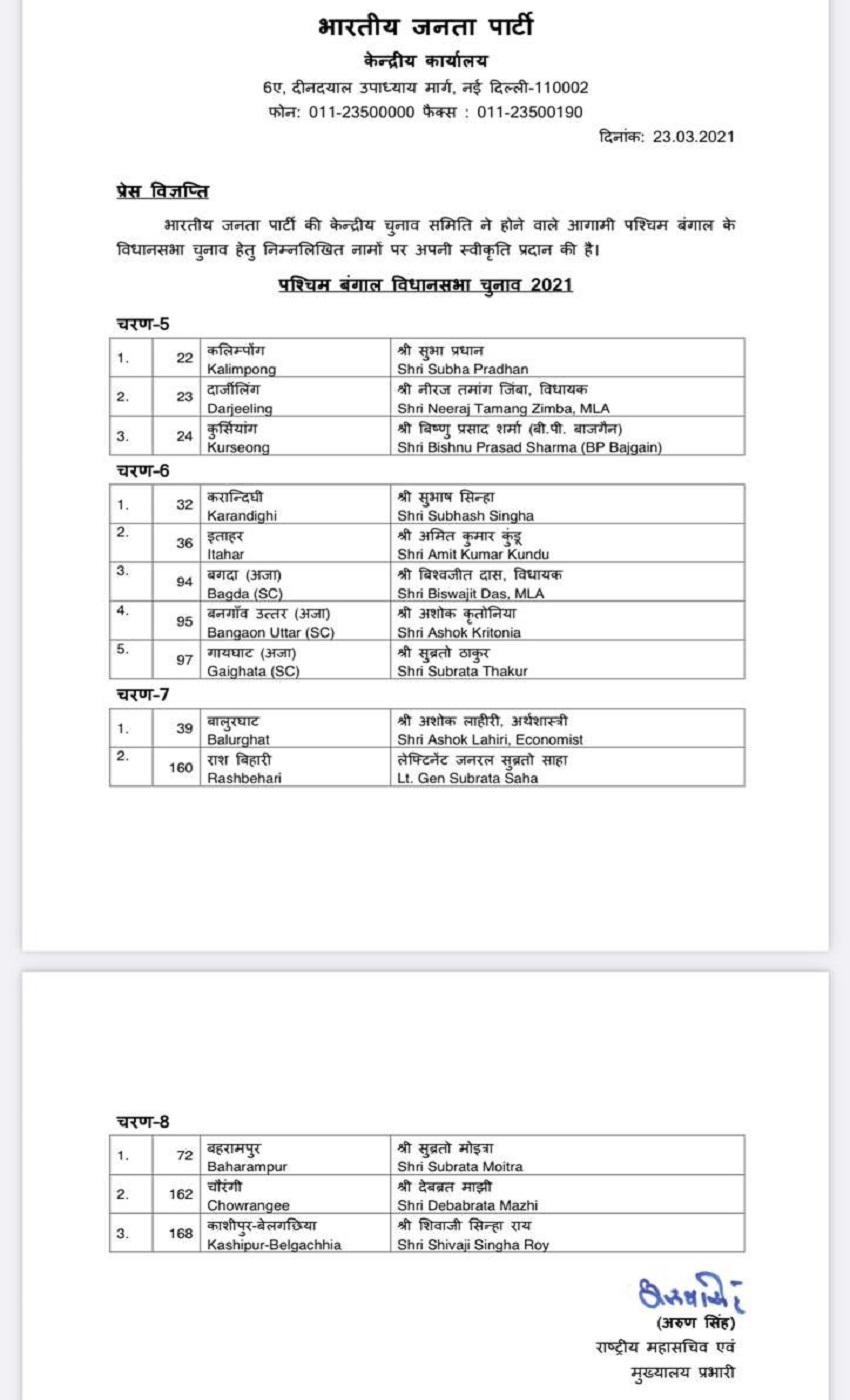 सातवें चरण में पार्टी ने लिस्ट में बालुरघाट से अशोक लाहिरी व राश बिहारी से लेफ्टिनेंट जनरल सुब्रतो साहा को उतारा, जबकि आठवें चरण के लिए बहरामपुर सीट से सुब्रतो मोइत्रा, चौरंगी से देवब्रत माझी और काशीपुर बेलगछिया से शिवाजी सिन्हा राय को मौका दिया। बता दें कि बंगाल में आठ चरण में विस चुनाव होने हैं।