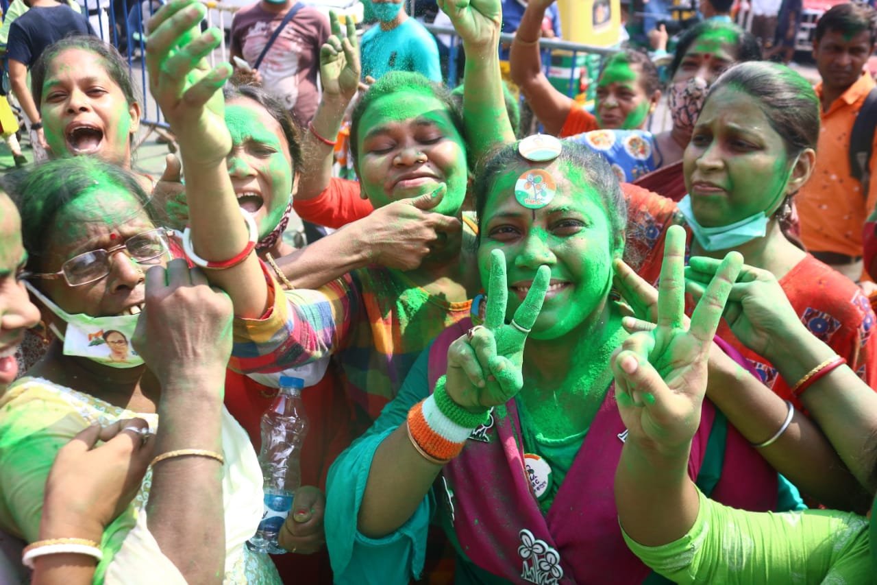 कोलकाता में ममता बनर्जी के आवास के बाहर टीएमसी कार्यकर्ता जश्न मना रहे हैं।