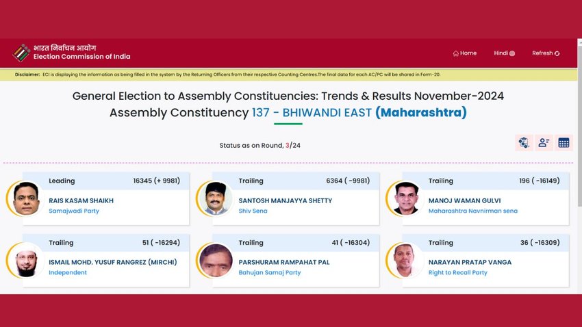 भिवंडी पूर्व सीट पर बड़ा उलटफेर देखने को मिला है। इस सीट पर समाजवादी पार्टी के रईस कसम खान आगे निकल गए हैं। चुनाव आयोग द्वारा जारी आंकड़ों के मुताबित, उन्हें 16 हजार से अधिक वोट मिले हैं। वहीं, शिवसेना के संतोष मंजैया शेट्टी दूसरे स्थान पर चले गए हैं।