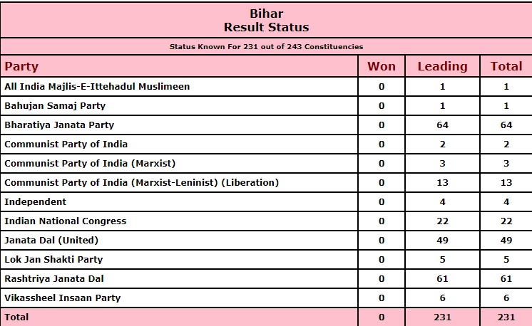 इधर 11:20 बजे तक एपीबी के मुताबिक रुझान में एनडीए गठबंधन 129 सीटों पर, महागठबंधन 101 सीटों पर आगे हैं। चुनाव आयोग के मुताबिक भाजपा 64 सीटों पर आगे हैं। इसी तरह आरजेडी 61, जेडीयू 49 सीटों, कांग्रेस 22, वामदल 21 सीटों, वीआईपी 6 सीटों, बसपा एक सीट पर आगे हैं।