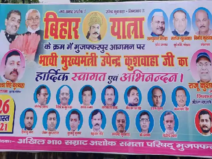 26 अगस्त को उपेंद्र कुशवाहा बिहार यात्रा को लेकर मुजफ्फरपुर आने वाले हैं। कुशवाहा के स्वागत में यह पोस्टर अखिल भारतीय सम्राट अशोक समता परिषद ने लगवाए हैं। इसमें लिखा है कि भावी मुख्यमंत्री का हार्दिक स्वागत और अभिनंदन। इस पोस्टर को लेकर कई सवाल खड़े हो रहे हैं। मीडिया रिपोर्ट्स के मुताबिक जेडीयू के जिलाध्यक्ष मनोज कुमार कुशवाहा ने कहा कि यह पोस्टर पार्टी को बदनाम करने के इरादे से लगाया गया है।
