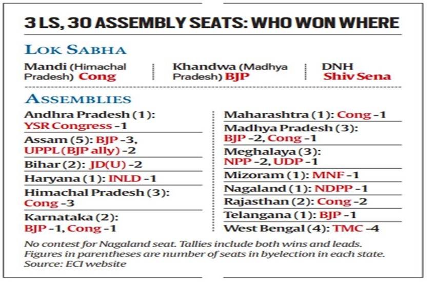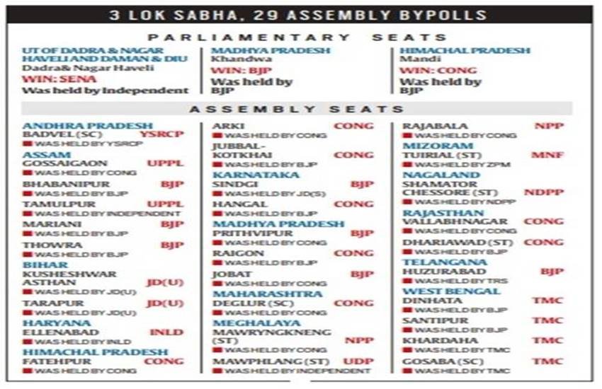 राज्य में कांग्रेस ने मंडी लोकसभा सीट और तीनों विधानसभा सीटों फतेहपुर, अर्की और जुबल-कोटखाई पर जीत हासिल कर ली है। निर्वाचन आयोग द्वारा मंगलवार को घोषित चुनाव परिणाम के अनुसार, कांग्रेस ने अपनी फतेहपुर और अर्की सीटें बरकरार रखी हैं। वह जुबल-कोटखाई सीट भाजपा से छीनने में कामयाब हुई है।