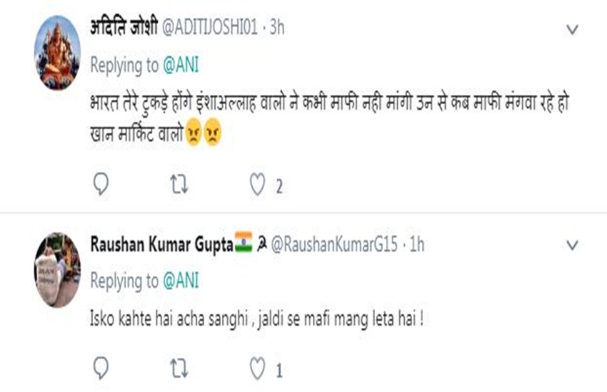 एक यूजर कहते हैं ‘इसे कहते हैं अच्छा संघी जल्दी से माफी मांग लेता है।’ एक यूजर ने कहा ‘भारत तेरे टुकड़े होंगे इंशाअल्लाह वालो ने कभी माफी नही मांगी उन से कब माफी मंगवा रहे हो खान मार्किट वालों।’