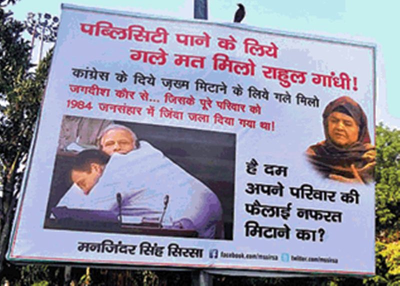 उधर, गोवा बीजेपी के प्रवक्ता दत्ता प्रसाद नायक ने कांग्रेस अध्यक्ष द्वारा पीएम को गले लगाने पर उन्हें लोफर कहा है। नायक ने कहा कि राहुल गांधी को न तो देश के मुद्दों की समझ है और न ही वो देश की जनभावना की समझ रखते हैं। उन्होंने लोकतंत्र के मंदिर में पीएम को गले लगाकर अपने लोफर होने का परिचय दिया है। नायक ने कांग्रेस को गांधी परिवार की कठपुतली करार दिया। दिल्ली में भी अकाली-भाजपा गठबंधन के विधायक मनजिंदर सिंह सिरसा ने दिल्ली के कई इलाकों में पीएम से गले मिलनेवाली तस्वीर लगी होर्डिंग्स लगवाकर राहुल गांधी पर निशाना साधा है और नसीहत दी है कि कांग्रेस ने 1984 के दंगों में सिखों को जो जख्म दिया है, उसे मिटाने के लिए गले मिलो। होर्डिंग्स में जगदीश कौर नाम की एक महिला की भी तस्वीर छपी है। उसके बारे में लिखा है कि 1984 में जसवीर के पूरे परिवार को जिंदा जला दिया गया था।