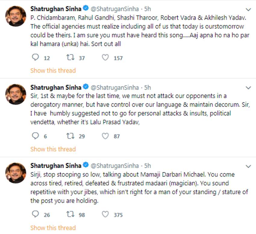 सिन्हा ने अगले ट्वीट में लिखा, “सर, पहली और संभवत: आखिरी बार, हमें कभी भी अपने विरोधियों पर अपमानजनक तरीके से हमला नहीं करना चाहिए। लेकिन हम अपनी भाषा पर नियंत्रण नहीं रख पाते। मैं आपको विनम्रतापूर्वक सुझाव देता हूं कि राजनीतिक प्रतिशोध के लिए व्यक्तिगत हमले और अपमान न किए जाएं चाहे वह लालू प्रसाद यादव, पी. चिदंबरम, राहुल गांधी, शशि थरूर, राबर्ट वाड्रा और अखिलेश यादव ही क्यों न हों। हमें और आधिकारिक एजेंसियों को यह महसूस होना चाहिए कि आज जो हमारा है, कल उनका हो सकता है। मैं आश्वस्त हूं कि आपने यह गाना जरूर सुना होगा, ‘आज अपना हो ना हो पर कल हमारा है।’ यह सभी के लिए है।”