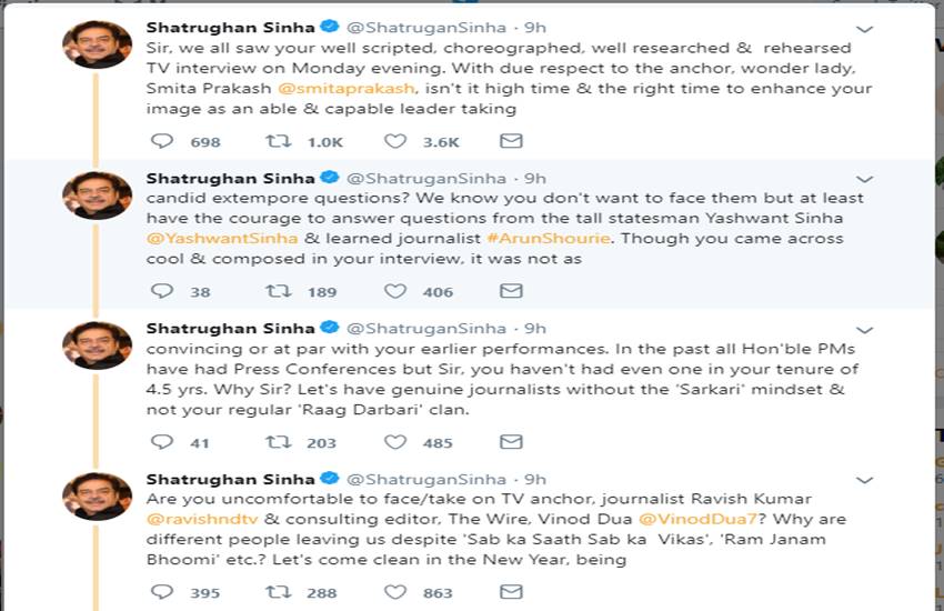 शत्रुघ्न सिन्हा ने ट्वीट किया, ‘सर, हमसब ने आपका स्क्रिप्टेड, बनावटी, अच्छे तरीके से खोजबीन और अभ्यास किया गया टीवी इंटरव्यू देखा। एंकर (वंडर लेडी) के प्रति पूरा सम्मान जताते हुए मैं यह कहना चाहता हूं कि क्या यह उचित समय नहीं है कि आप एक समर्थ और सक्षम नेता की अपनी छवि को सुधारने के लिए बेबाक सवालों का जवाब दें? मैं जानता हूं कि आप उनका सामना नहीं करना चाहते हैं, लेकिन कम से कम यशवंत सिन्हा जैसे दिग्गज नेता और अरुण शौरी जैसे विद्वान पत्रकार के सवालों का जवाब देने की तो हिम्मत दिखाइए। हालांकि, इंटरव्यू में आप बेहद संयमित नजर आए, लेकिन आपके पूर्व के प्रदर्शन को देखते हुए आप उतने यकीनी नहीं दिखे।’
