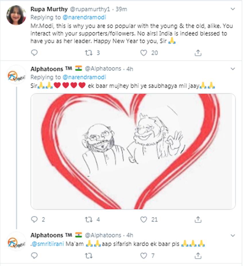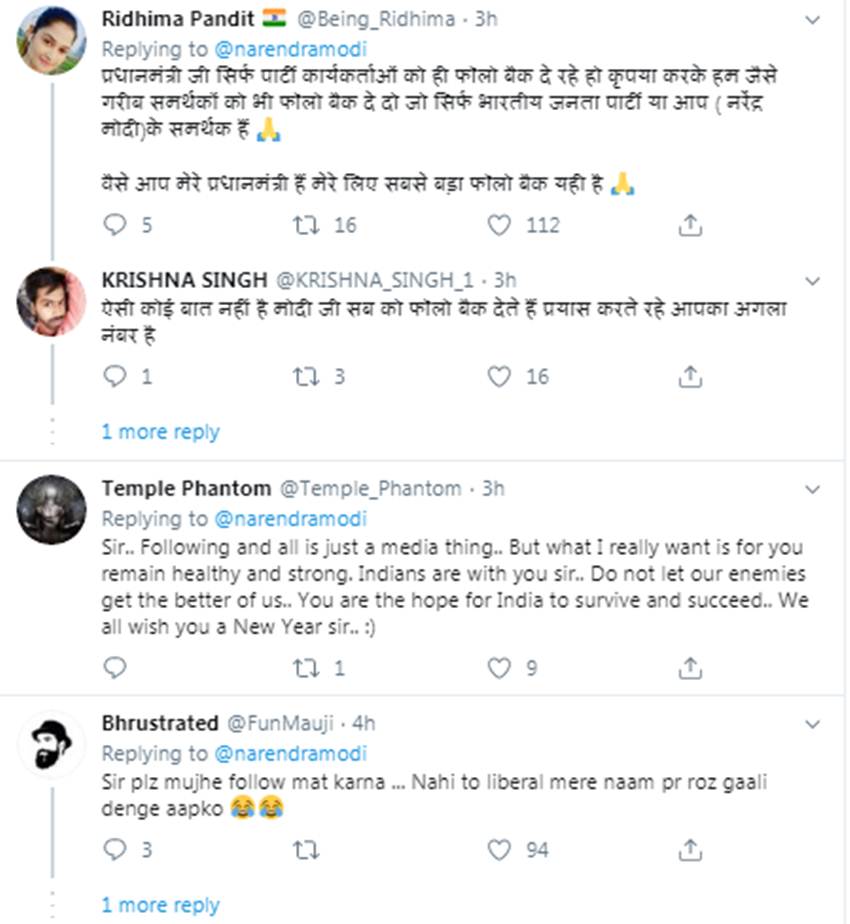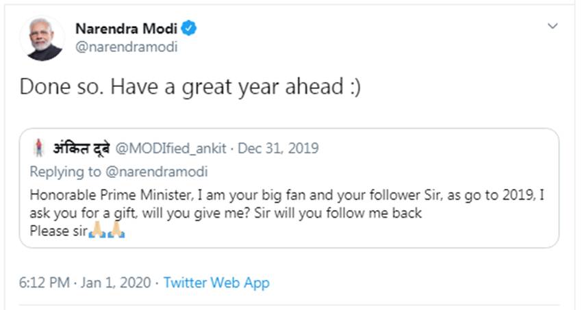 पीएम ने इस पर उस दिन तो कोई रिप्लाई नहीं किया, पर बुधवार यानी 1 जनवरी 2020 को इसी फैन के ट्वीट को रीट्वीट कर कमेंट में लिखा, “मैं कर (फॉलो) लिया है। आपका आने वाला साल बेहद शानदार रहे।”