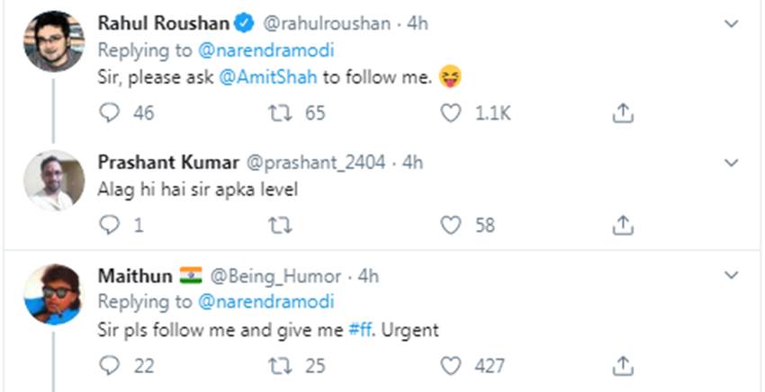 पीएम के इस दिलदार अंदाज के बाद कुछ फॉलोअर्स, फैंस और सोशल मीडिया यूजर्स ने उनसे अपने-अपने टि्वटर हैंडल भी फॉलो करने की गुजारिश कर दी। इसी बीच, कुछ लोगों ने पीएम द्वारा फॉलोअर को यह खास तोहफा दिए जाने की तारीफ भी की गई।