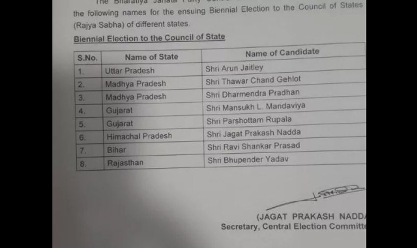 भारतीय जनता पार्टी ने बुधवार को अपने राज्यसभा उम्मीदवारों के नाम का ऐलान कर दिया है। उत्तर प्रदेश से वित्त मंत्री अरुण जेटली को पार्टी ने उम्मीदवार बनाया है। मध्य प्रदेश की दो सीटों के लिए थावर चंद गहलोत और उर्जा मंत्री धर्मेद्र प्रधान के नाम का ऐलान किया गया है। गुजरात की बात करें तो वहां की दो सीटों के लिए मनसुख लाल मंडाविया और पुरुषोत्तम रुपाला को बीजेपी ने उम्मीदवार बनाया है। हिमाचल प्रदेश से स्वास्थ मंत्री जे पी नड्डा को राज्यसभा का उम्मीदवार बनाया गय़ा है। केंद्रीय कानून मंत्री रविशंकर प्रसाद को बिहार के रास्ते राज्यसभा भेजने का तय हुआ है तो वहीं राजस्थान से भूपेंद्र यादव को उम्मीदवार बनाया गया है।