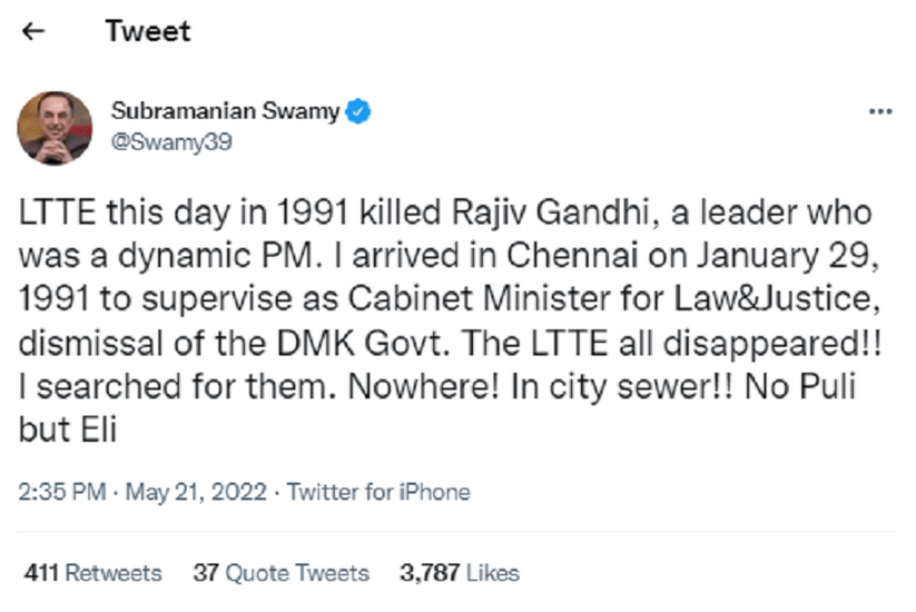 राजीव पर स्वामी ने क्या और किस संदर्भ में कहा?: पूर्व राज्यसभा सांसद सुब्रमण्यम स्वामी ने माइक्रो ब्लॉगिंग प्लैटफॉर्म टि्वटर पर एक ट्वीट किया था, “लिब्रेशन टाइगर्स ऑफ तमिल एलम (LTTE) ने आज ही के दिन साल 1991 में राजीव गांधी की हत्या कर दी थी। वह नेता एक डायनामिक पीएम थे। मैं 29 जनवरी, 1991 को चेन्नई पहुंचा था। डीएमके सरकार की बर्खास्तगी के बाद मैं वहां कानून और न्याय मामलों के कैबिनेट मंत्री के रूप में निगरानी करने गया था। उस वक्त लिट्टे के सब लोग गायब हो गए थे!! मैंने उनकी तलाश भी की। अब वह कहीं नहीं हैं!