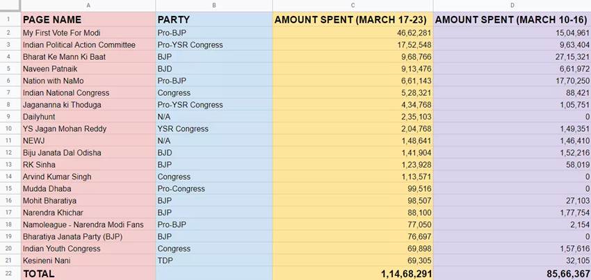 Alt News की रिपोर्ट के अनुसार, भाजपा द्वारा ही समर्थित एक फेसबुक पेज Nation with Namo 10 मार्च से 16 मार्च तक करीब 17 लाख रुपए खर्च कर उस हफ्ते दूसरे नंबर पर था। इस रिपोर्ट के अध्ययन के आधार पर कह सकते हैं कि भाजपा समर्थित कई फेसबुक पेज सोशल मीडिया पर सक्रिय हैं, जिनमें बारी-बारी से पैसा लगाया जा रहा है। राजनीतिक पार्टियों द्वारा समर्थित फेसबुक पेजेज पर कुल खर्चे की बात करें तो भाजपा समर्थित पेजेज पर कुल खर्चा बीते हफ्ते 67 लाख रुपए रहा। वहीं वाईएसआर कांग्रेस समर्थित फेसबुक पेजेज पर यह खर्च 24 लाख रहा। बीजद में 10.5 लाख और कांग्रेस समर्थित पेजेज पर बीते हफ्ते 8 लाख रुपए खर्च किए गए।