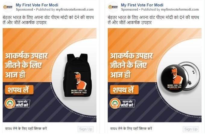 वोट के बदले दिए जा रहे फ्री गिफ्ट!: खबर के अनुसार, यह भी पता चला है कि भाजपा समर्थित फेसबुक पेजेज पर प्रधानमंत्री मोदी को वोट देने के बदले कई आकर्षक गिफ्ट फ्री बांटे जा रहे हैं। इन फ्री गिफ्ट्स के तहत लोगों को बैग्स, टी-शर्ट, फोन कवर आदि दिए जा रहे हैं। भाजपा अपनी आधिकारिक वेबसाइट पर भी उपरोक्त सामानों को ऑनलाइन बेच भी रही है। खुद पीएम मोदी एक ट्वीट में इस बात की जानकारी दे चुके हैं।
