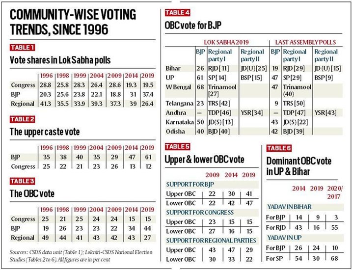 2019 के लोकसभा चुनावों के दौरान बीजेपी ने ओबीसी मतदाताओं के बीच बड़े पैमाने पर पैठ बनाई, जिससे क्षेत्रीय दलों के मूल समर्थन में सेंध लग गई, जिनका वोट शेयर घटकर 26.4 फीसदी ही रह गया। लोकनीति-सीएसडी द्वारा किए गए सर्वे के अनुसार भाजपा ने पिछले एक दशक के दौरान ओबीसी मतदाताओं के बीच बड़े पैमाने पर पैठ बनाई है। 2009 के लोकसभा चुनावों में, 22% ओबीसी ने भाजपा को वोट दिया था, जबकि 42% ने क्षेत्रीय दलों को वोट दिया था। लेकिन एक दशक के भीतर, ओबीसी के बीच भाजपा का जनाधार नाटकीय रूप से बदल गया है। 2019 के लोकसभा चुनावों के दौरान, 44% ओबीसी ने भाजपा को वोट दिया, जबकि केवल 27% ने क्षेत्रीय दलों को वोट दिया।