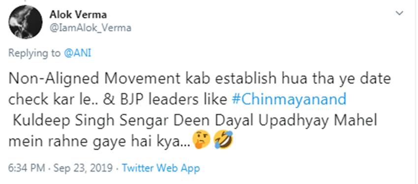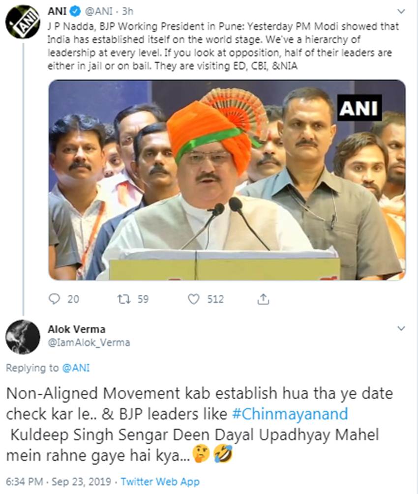 भारतीय जनता पार्टी (बीजेपी) के कार्यकारी अध्यक्ष जेपी नड्डा प्रधानमंत्री नरेंद्र मोदी को लेकर दिए एक बयान के चलते सोशल मीडिया पर ट्रोल हो गए। उन्होंने विपक्ष पर तंज कसते हुए कहा कि दुनिया भर में पीएम मोदी की जय-जय हो रही है, पर विपक्षी जेल में हैं या फिर बेल पर बाहर जांच एजेंसियों के शिकंजे पर हैं। टि्वटर पर इसी के जवाब में लोगों ने जवाब दिया और लिखा- गुट निरपेक्ष आंदोलन कब स्थापित हुआ? उसकी तारीख चेक कर लीजिए…और हां, चिन्मयानंद व कुलदीप सिंह सेंगर दीन दयाल उपाध्याय महल में रहने गए हैं क्या?