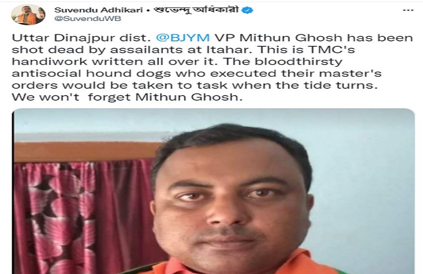 अपने एक ट्वीट में सुवेंदु अधिकारी ने लिखा कि, “भाजपा युवा मोर्चा के नेता मिथुन घोष की इटाहार में गोली मारकर हत्या कर दी गई है। इस हत्या के पीछे टीएमसी का हाथ है।” उन्होंने आगे लिखा कि खून के प्यासे असामाजिक तत्वों ने अपने मालिक के आदेश पर इस हत्या को अंजाम दिया है। हम मिथुन घोष को नहीं भूलेंगे। सही समय आने पर इसका जवाब दिया जाएगा।”