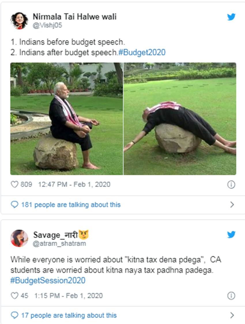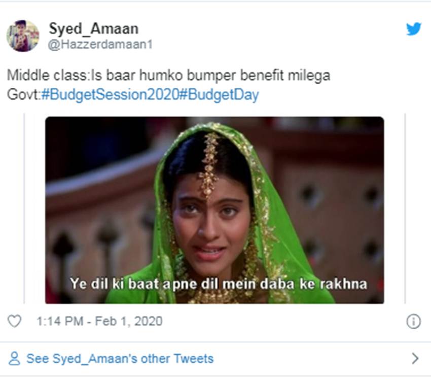 पांच से साढ़े सात लाख रुपये तक की आय पर 10 प्रतिशत, साढ़े सात से 10 लाख रुपये तक की आय पर 15 प्रतिशत, 10-12.5 लाख रुपये तक की आय पर 20 प्रतिशत और 12.5 से 15 लाख रुपये तक की आय पर 25 प्रतिशत की दर से आयकर का प्रस्ताव है। पंद्रह लाख रुपये से ऊपर की आय पर 30 प्रतिशत की दर से आयकर लगेगा। बजट में वित्त मंत्री के ऐलान को लेकर सोशल मीडिया पर लोगों ने खूब मजे लिए हैं। सोशल मीडिया पर कई सारे मीम्स वायरल हो रहे हैं।