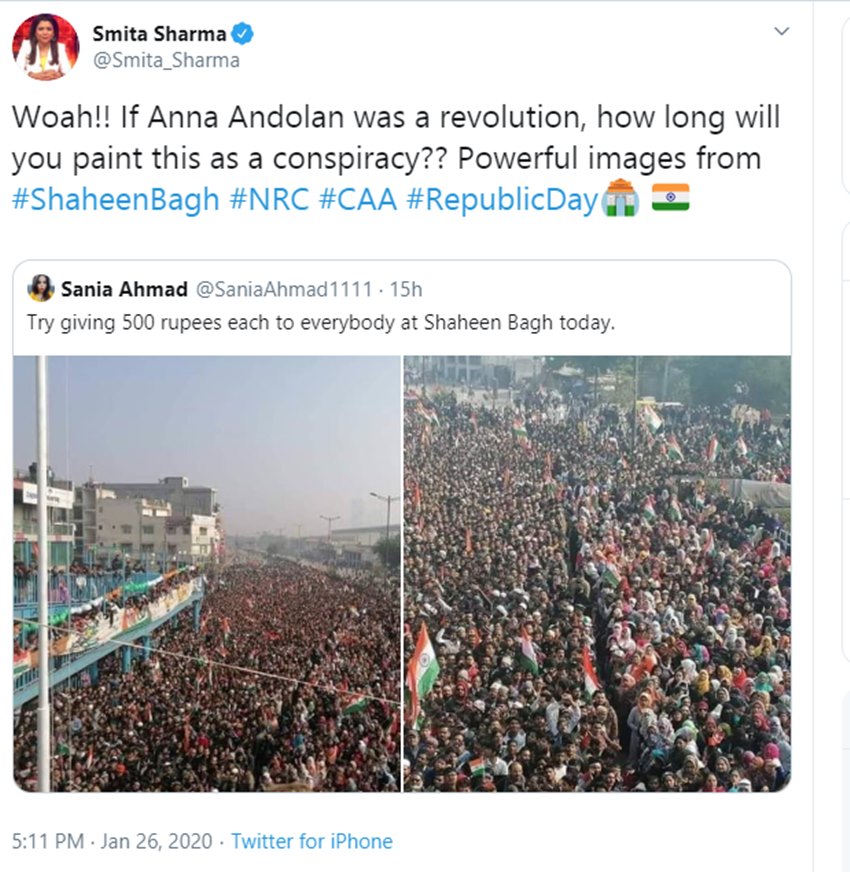 सोशल मीडिया यूजर सानिया अहमद ने दो तस्वीरें शेयर की है। तस्वीरों में काफी संख्या में लोग दिख रहे हैं और उनके हाथों में झंडे हैं। सानिया ने लिखा, “शाहीन बाग में हर किसी को 500 रुपये देने की कोशिश करें।” स्वतंत्र पत्रकार स्मिता शर्मा ने इन तस्वीरों को शेयर करते हुए लिखा, “वाह! यदि अन्ना आंदोलन के एक क्रांति थी, तो आप इसे कब तक एक साजिश के रूप में बताएंगे? गणतंत्र दिवस के अवसर पर शाहीन बाग से दमदार तस्वीरें।”