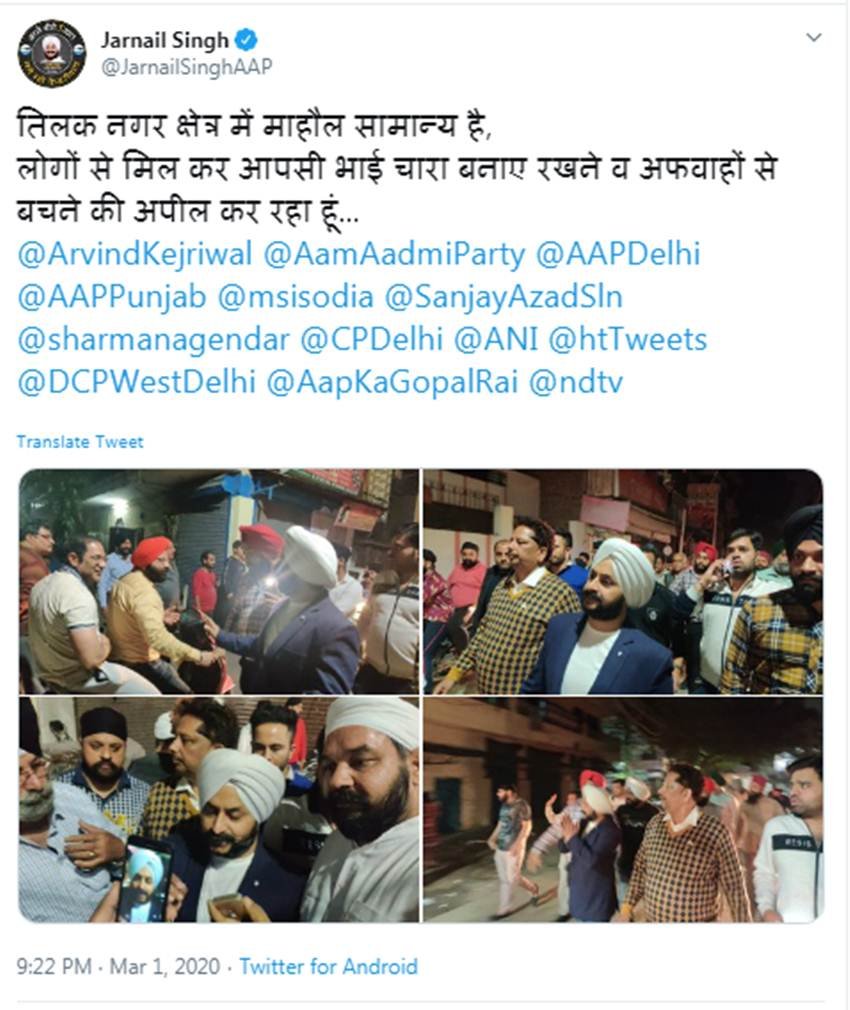 तिलक नगर के विधायक जरनैल सिंह ने लोगों से शांति बनाए रखने का अनुरोध किया। उन्होंने कहा, ‘‘दंगे की अफवाह के बारे में सुनते ही मैं घटनास्थल पर पहुंचा, दुकानें बंद थीं और लोग दहशत में थे लेकिन किसी ने भी दंगा होते नहीं देखा। यह अफवाह फैलाने और माहौल खराब करने की साजिश है। मैं लोगों से शांति और भाईचारा बनाए रखने और अफवाहों पर भरोसा नहीं करने की अपील करता हूं।’’