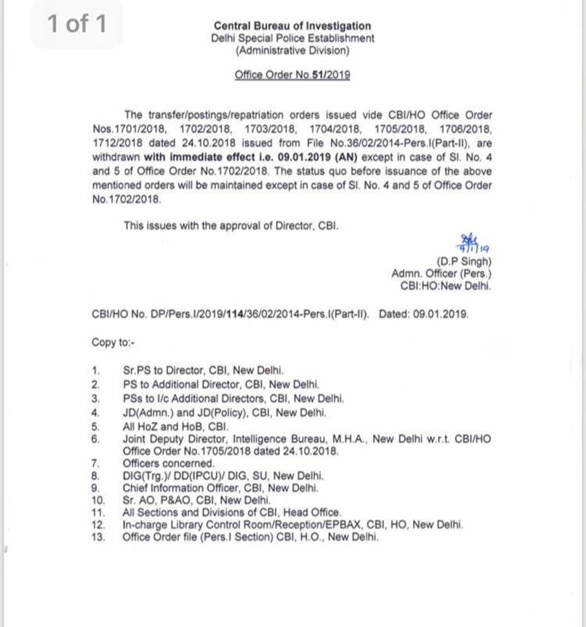 वर्मा और उप विशेष निदेशक राकेश अस्थाना के खिलाफ एजेंसी ने भ्रष्टाचार का मामला दर्ज किया था और दोनों अधिकारियों को छुट्टी पर भेजने वाला अक्टूबर का यह आदेश एजेंसी के इतिहास में सरकार के हस्तक्षेप का यह अपनी तरह का पहला मामला था। सरकार ने न्यायालय में यह कहकर अपने निर्णय को सही ठहराने की कोशिश की कि एजेंसी के दो वरिष्ठतम अधिकारी एक-दूसरे पर भ्रष्टाचार के आरोप लगा रहे थे ऐसे लड़ाई झगड़े में यह कदम उठाना आवश्यक था लेकिन शीर्ष अदालत ने उनकी यह दलील खारिज कर दी।