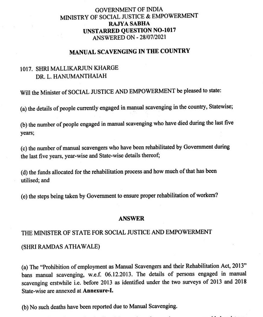 दरअसल राज्यसभा के एक सवाल के जवाब में केंद्रीय सामाजिक न्याय एवं अधिकारिता राज्यमंत्री रामदास अठावले ने कहा है कि हाथ से मैला उठाने वाले 66,692 लोगों की पहचान हुई है। यह प्रश्न किए जाने पर कि हाथ से मैला ढोने वाले ऐसे कितने लोगों की मौत हुई है,पर उन्होंने कहा, ‘‘हाथ से सफाई के कारण किसी के मौत होने की सूचना नहीं है।’’ सरकार हाथ से मैला सफाई के कारण मौत को मान्यता नहीं देती और इसके बजाय इसे खतरनाक तरीके से शौचालय टैंक एवं सीवर की सफाई के कारण मौत बताती है।