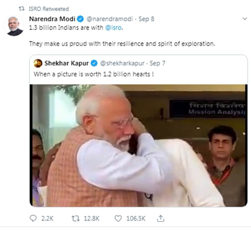 चीन के लोगों ने भारत के दूसरे चंद्र मिशन से जुड़े वैज्ञानिकों की इंटरनेट पर काफी सराहना की है और उनसे उम्मीद न छोड़ने तथा ब्रह्मांड में खोज जारी रखने को कहा है। यह बात सोमवार को यहां आधिकारिक मीडिया ने कही। भारतीय अंतरिक्ष अनुसंधान संगठन (इसरो) के एक अधिकारी ने सोमवार को कहा, ‘‘ऑर्बिटर के कैमरे से भेजी गईं तस्वीरों के मुताबिक यह तय जगह के बेहद नजदीक एक ‘हार्ड लैंडिंग’ थी। लैंडर वहां साबुत है, उसके टुकड़े नहीं हुए हैं। वह झुकी हुई स्थिति में है।’’