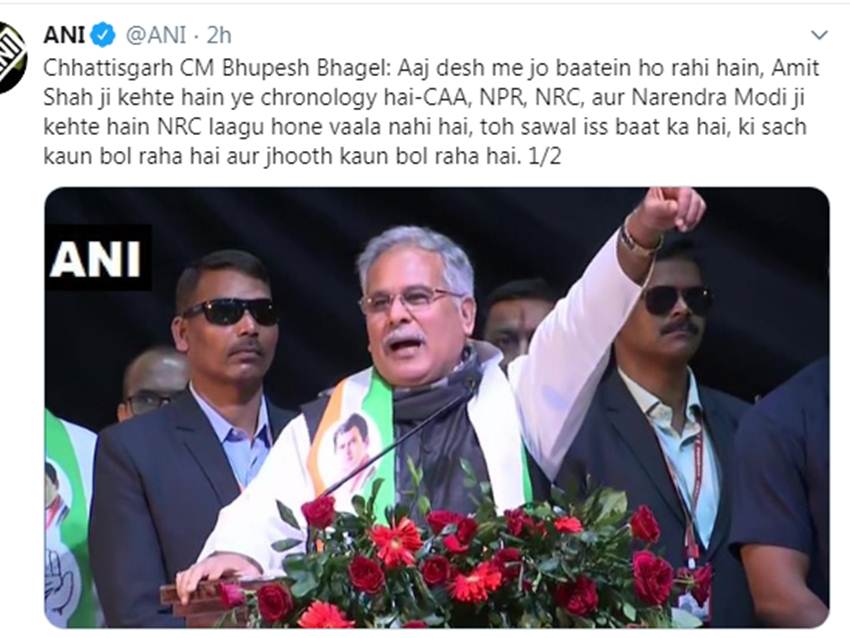 छत्तीसगढ़ के मुख्यमंत्री भूपेश बघेल ने पीएम नरेंद्र मोदी और गृह मंत्री अमित शाह को नागरिकता संशोधित कानून, एनआरसी और एनपीआर लेकर निशाना साधा है। बघेल का कहना है कि प्रधानमंत्री और गृह मंत्री के बीच मनमुटाव हो गया है और उसके कारण पूरा देश पिस रहा है।मुख्यमंत्री बघेल शुक्रवार को नवनिर्वाचित पार्षदों के सम्मान समारोह में बोल रहे थे।
