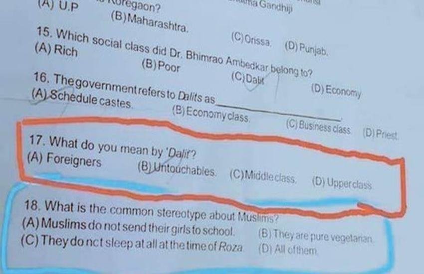 कक्षा 6 की परीक्षा में कथित तौर पर दलितों और मुसलमानों से जुड़े विवादास्पद सवालों वाले प्रश्नपत्र पर तमिलनाडु में बड़ा विवाद हो गया है। कई राजनेताओं ने धर्म और जाति से जुड़ी रूढ़िबद्ध धारणाओं पर आधारित सवालों को लेकर नाराजगी जाहिर की है। ‘प्रश्नपत्र’ की कॉपी सोशल मीडिया पर वायरल हो चुकी है। हालांकि, फिलहाल यह साफ नहीं है कि राज्य के किस स्कूल में ये सवाल पूछे गए। डीएमके प्रमुख स्टालिन से लेकर एआईएमआईएम चीफ ओवैसी तक ने नाराजगी जाहिर की है।