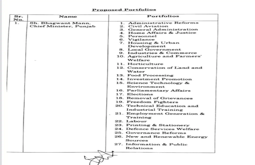 वहीं खुद सीएम भगवंत मान के पास गृह मंत्रालय और जस्टिस, विजिलेंस, कार्मिक, आवासन एवं शहरी विकास, सिविल एविएशन, प्रशासनिक सुधार, एग्रीकल्चर एवं फार्मर्स वेलफेयर, लोकल गवर्नमेंट, इंडस्ट्रीज एवं कॉर्मेस समेत कुल 27 विभाग होंगे। अभी मान के पास वो सभी विभाग होंगे जिनके मंत्री नियुक्त नहीं किये गए हैं।