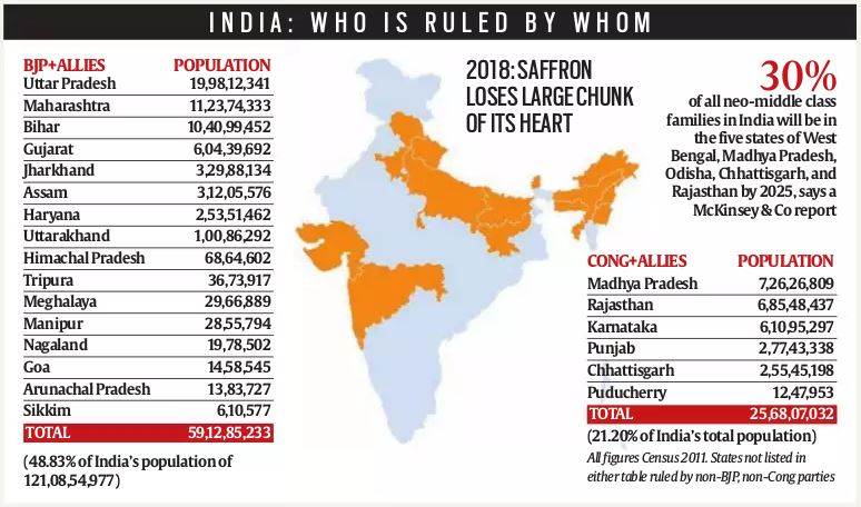 इस साल मार्च में बीजेपी ने आंध्र प्रदेश की चंद्रबाबू नायडू सरकार से नाता तोड़ लिया था। वहीं, जम्मू-कश्मीर में महबूबा मुफ्ती की सरकार जून में गिरने के बाद अब बीजेपी के शासन में देश की 49 प्रतिशत आबादी रह गई है। नॉर्थ ईस्ट के तीन राज्यों में हुए विधानसभा चुनावों के बाद यह आंकड़ा करीब 70 फीसदी का था। बता दें कि मध्य प्रदेश, राजस्थान और छत्तीसगढ़ में क्रमश: 29, 25 और 11 लोकसभा सीटें हैं। बीजेपी ने 2014 के आम चुनाव में इन 65 में से 62 सीटों पर जीत हासिल की थी। बीजेपी को एमपी में सिर्फ 2 जबकि छत्तीसगढ़ में एक सीट गंवानी पड़ी थी। हालांकि, बीजेपी को तीसरी सीट का नुकसान मध्य प्रदेश के रतलाम में नवंबर में हुए उप चुनाव में हुआ।