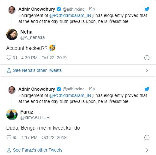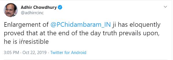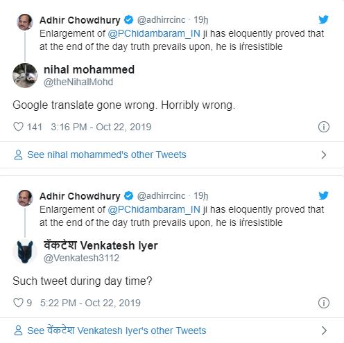 अब चिदंबरम की जमानत से जुड़ा जो ट्वीट अधीर रंजन ने किया उसमें ऐसे शब्दों का इस्तेमाल किया गया जिससे यूजर्स कंफ्यूज हो गए। कुछ यूजर्स ने उनके ट्वीट को गूगल ट्रांसलेट वाला बताया है जबकि कुछ यूजर्स ने सलाह दी कि वो बंगाली में ही ट्वीट किया करें। खास बात है कि कांग्रेस नेता ने अभी तक ना अपना ट्वीट डिलीट किया है और ना ही इसपर कोई सफाई दी है।