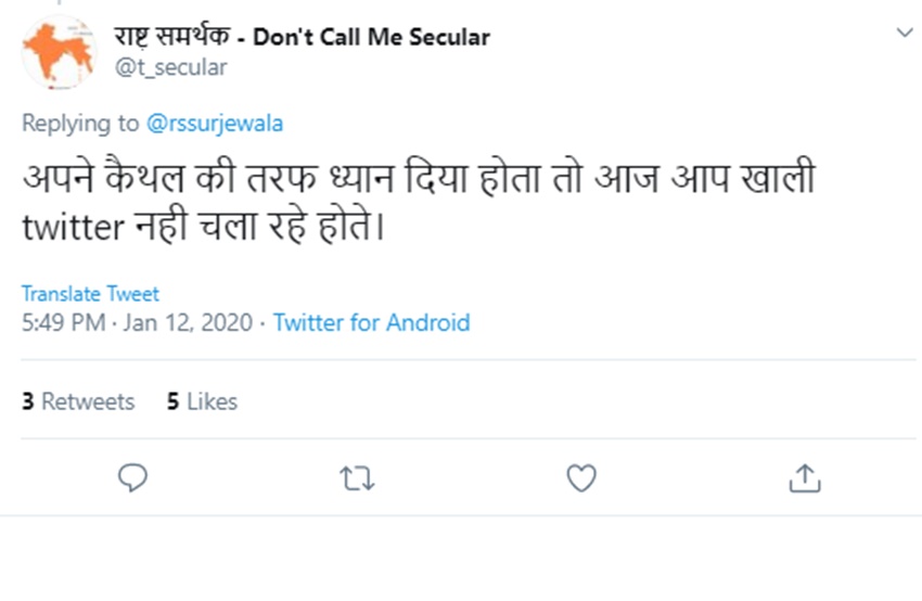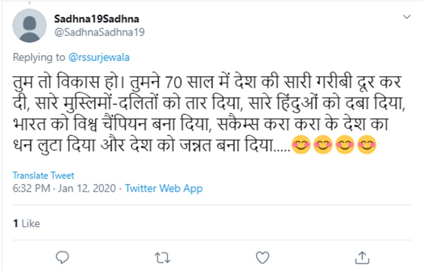 हूं विकास छूँ ! हूँ गुजरात छूँ! pic.twitter.com/aA9969ZgBf— Randeep Singh Surjewala (@rssurjewala) January 12, 2020