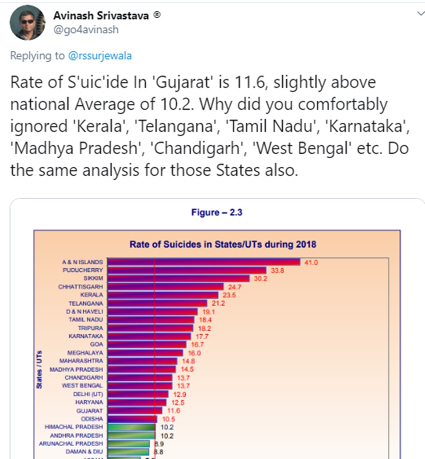 एक यूजर ने इस पर अपनी प्रतिक्रिया देते हुए लिखा कि ‘तुम तो विकास हो। तुमने 70 साल में देश की सारी गरीबी दूर कर दी, सारे मुस्लिमों-दलितों को तार दिया, सारे हिंदुओं को दबा दिया, भारत को विश्व चैंपियन बना दिया, सकैम्स करा करा के देश का धन लुटा दिया और देश को जन्नत बना दिया।’ अविनाश श्रीवास्तव नाम के एक यूजर ने इसपर अपनी प्रतिक्रिया देते हुए लिखा कि ‘गुजरात में आत्महत्या की दर 11.6 है जो राष्ट्रीय औसत से थोड़ा ही ज्यादा है। तो फिर आप इतनी आसानी से केरल, तेलंगाना, तमिलनाडु, कर्नाटक, मध्य प्रदेश, चंडीगढ़, पश्चिम बंगाल जैसे राज्यों के आंकड़ों को नजरअंदाज क्यों करते हैं?’