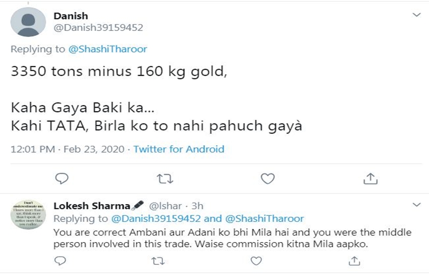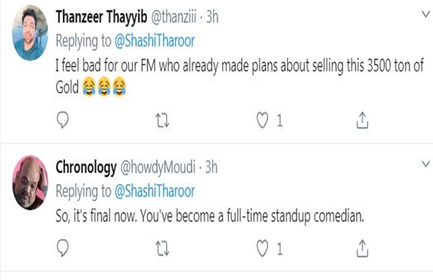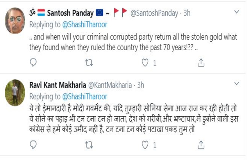 वहीं थरूर के इस ट्वीट पर लोगों ने अलग-अलग प्रतिक्रियाएं दी हैं। एक यूजर ने कहा ‘3350 टन सोने में से सिर्फ 160 किलो ग्राम सोना ही हाथ लगा। कहां गया बाकी का…कही टाटा, बिरला को तो नहीं पहुंच गया।’ एक यूजर ने इस ट्वीट के जवाब में कहा ‘एकदम सही कहा अंबानी और अडानी को भी मिला है। वैसे कमीशन कितना मिला आपको।’