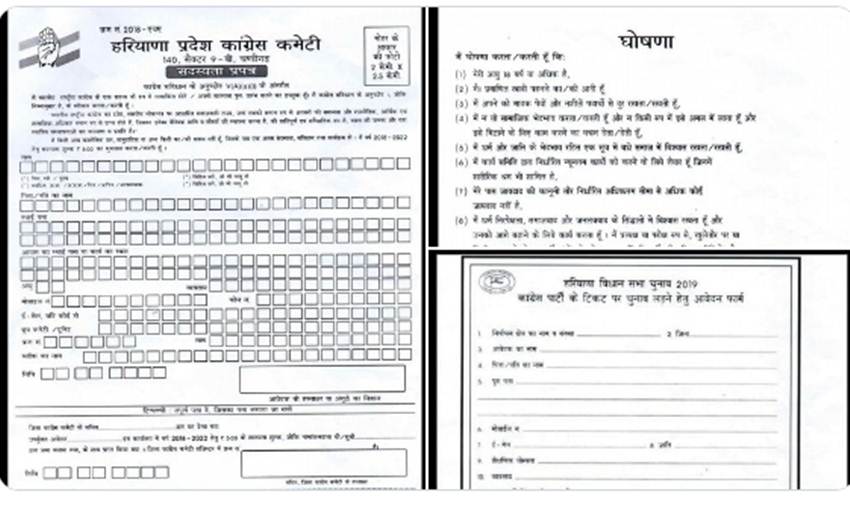 हरियाणा में भितरघात और गुटबाजी से जूझ रही कांग्रेस पार्टी ने सत्ता में वापसी के लिए कमर कस ली है। नई प्रदेश कांग्रेस अध्यक्ष कुमारी सैलजा ने राज्य में सदस्यता अभियान को नया कलेवर दिया है और विधान सभा चुनाव में पार्टी का टिकट चाहने वालों से आवेदन मंगवाया है। इसके लिए पार्टी ने बापू के पदचिह्नों पर चलने वाले समाज सेवियों से आवेदन मंगवाया है। आवेदन प्रपत्र में आवेदकों से 10 बिंदुओं वाले एक घोषणा पर हस्ताक्षर करवाया जा रहा है, जिसमें खादी पहनने, किसी तरह का मादक पेय और नशीली पदार्थों से दूर रहने का वचन लिया जा रहा है। 10 बिंदू वाली घोषणा में लिखा गया है कि आवेदक न तो सामाजिक भेदभाव करता है न किसी रूप में इस पर अमल करता है बल्कि इससे निबटने में सहयोग करेगा।