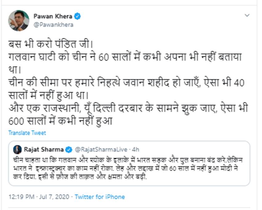 रजत शर्मा के इस ट्वीट पर पवन खेरा ने लिखा,” बस भी करो पंडित जी। गलवान घाटी को चीन ने 60 सालों में कभी अपना भी नहीं बताया था। चीन की सीमा पर हमारे निहत्थे जवान शहीद हो जाएँ, ऐसा भी 40 सालों में नहीं हुआ था। और एक राजस्थानी, यूँ दिल्ली दरबार के सामने झुक जाए, ऐसा भी 600 सालों में कभी नहीं हुआ”
