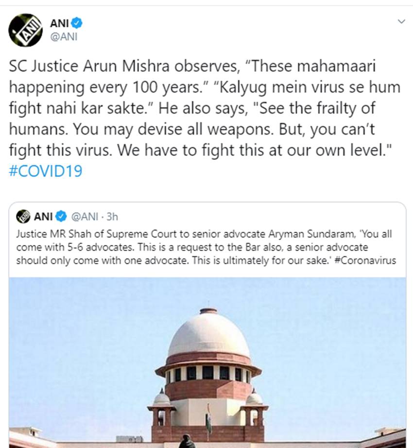 Corona Virus in India: देश में फैल रहे कोरोना वायरस को लेकर सुप्रीम कोर्ट के जज अरुण मिश्रा ने भी चिंता जताई है। उन्होंने कहा कि इस कलयुग में वायरस से लड़ना मुश्किल है। कोर्टरूम में उन्होंने कहा कि ऐसी महामारी हर 100 साल में आती है। कलयुग में हम वायरस से नहीं लड़ सकते हैं।
