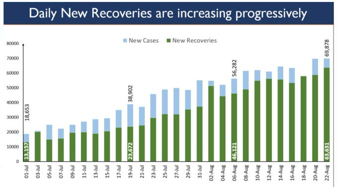 केंद्रीय स्वास्थ्य मंत्री हर्षवर्धन ने शनिवार को कहा कि भारत में कोविड-19 से ठीक होने की दर ‘सबसे बेहतर’ करीब 75 प्रतिशत है और इसमें रोजाना सुधार हो रहा है, जबकि मृत्युदर दुनिया में ‘सबसे कम’ 1.87 प्रतिशत है। दिल्ली के नजदीक गाजियबाद में राष्ट्रीय आपदा मोचन बल (एनडीआरएफ) के 10 बिस्तरों के अस्थायी अस्पताल का उद्घाटन करते हुए हर्षवर्धन ने कहा कि भारत ने आठ जनवरी से ही कोविड-19 से निपटने की रणनीति बनाने की शुरुआत कर दी थी जब दुनिया को इस महामारी की जानकारी मिली थी। उन्होंने कहा, ‘‘ कई बुद्धिमान लोगों, वैज्ञानिकों और नकारात्मक सोच वाले लोगों का आकलन था कि 135 करोड़ आबादी वाले भारत में जुलाई-अगस्त तक 30 करोड़ लोग कोरोना वायरस से संक्रमित होंगे और 50 से 60 लाख लोगों की मौत हो जाएगी और देश की स्वास्थ्य प्रणाली इस महमारी से निपटने में ‘अक्षम’ है।’’