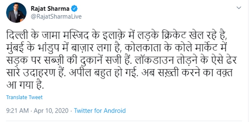 Coronavirus in India: इंडिया टीवी के एडिटर इन चीफ रजत शर्मा अपने एक ट्वीट के चलते सोशल मीडिया यूजर्स के निशाने पर आए गए हैं। दरअसल शुक्रवार (10 अप्रैल, 2020) को उन्होंने ट्वीट कर ऐसे शहरों के नाम बताए जहां कथित तौर पर लॉकडाउन का पालन नहीं किया जा रहा है। ट्वीट में उन्होंने कहा, ‘दिल्ली के जामा मस्जिद के इलाके में लड़के क्रिकेट खेल रहे हैं। मुंबई के भांडुप में बाजार लगा है। कोलकाता के कोले मार्केट में सड़क पर सब्जी की दुकानें सजी हैं। लॉकडाउन तोड़ने के ऐसे ढेर सारे उदाहरण हैं। अपील बहुत हो गई। अब सख्ती करने का वक्त आ गया है।’ पत्रकार शर्मा ने जिन क्षेत्रों के नाम बताए वो सभी गैर भाजपा शासित हैं। ऐसे में सोशल मीडिया यूजर्स ने उन्हें निशाने पर ले लिया।